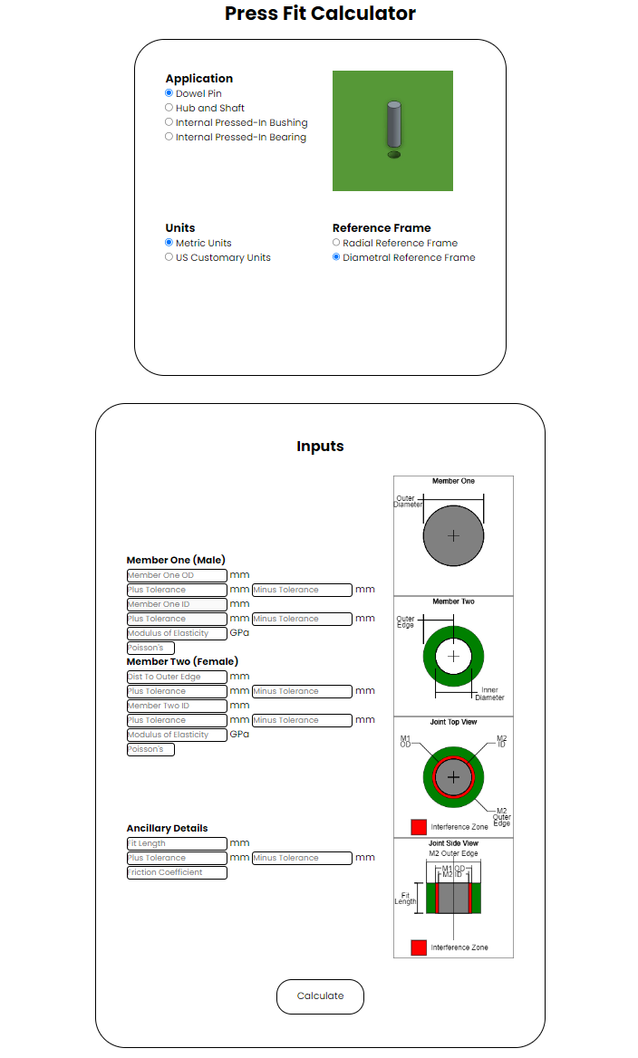 A calculator that will do some press fit calculations. It works pretty well so long as you stay within the bounds of the assumptions. It's also faster than doing the math by hand. If you're going to use it professionally, I would advise that you to double check your calculations by hand. It's been close on everything I've used it for but I haven't exactly spent a bunch of time trying to break it yet.