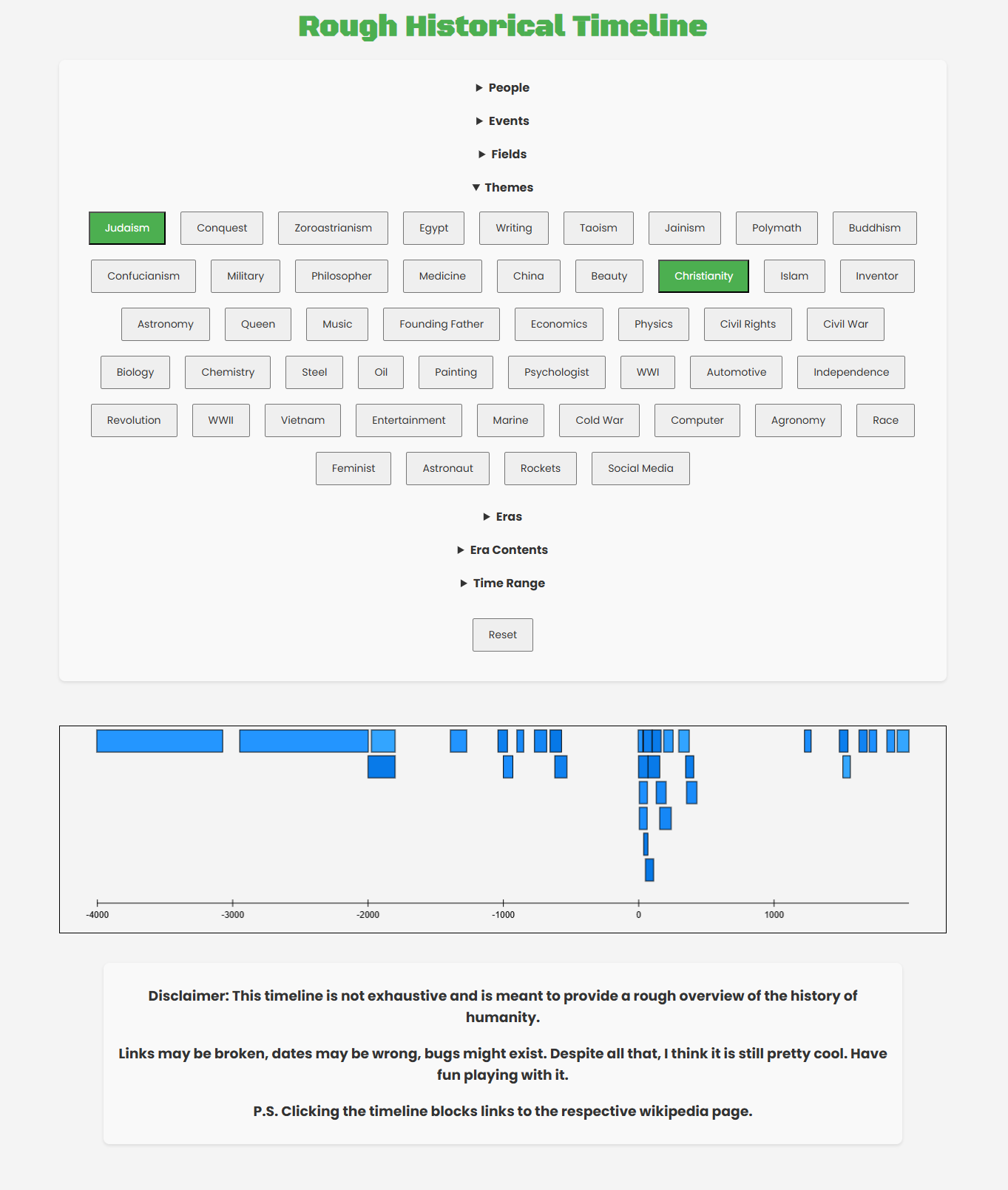 This webapp pulls from an JSON file to populate a graphic that scales automatically to display the lifespans of individuals, events, and eras in history.